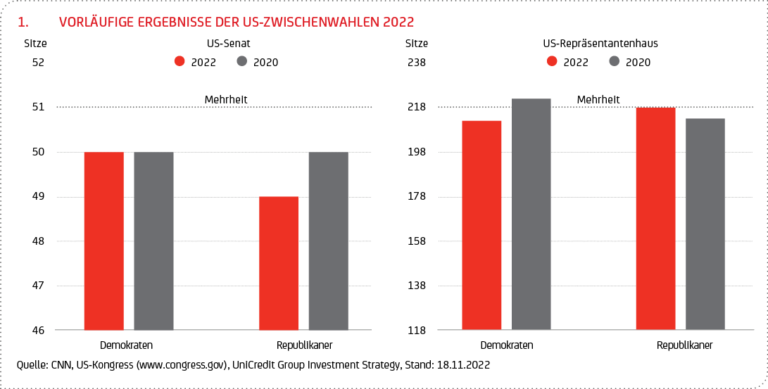 Trotz des überraschend guten Abschneidens der Demokraten gehen weder sie noch die Republikaner als klarer Sieger aus den Zwischenwahlen hervor. Vor diesem Hintergrund ist davon auszugehen, dass der amtierende US-Präsident auch weiterhin Schwierigkeiten haben dürfte, wichtige Teile seine Agenda umsetzen zu können. Schon bislang half Joe Biden die winzige Mehrheit im Senat nur bedingt, weil seine Vorhaben nicht nur bei den Republikanern, sondern auch in seinen eigenen Reihen auf Widerstand stießen. So scheiterten große Teile des ursprünglichen von der Biden-Regierung konzipierten „American Jobs Plan“ sowie des „American Families Plan“ zuletzt an der zu geringen Mehrheit der Demokraten in beiden Kammern des Kongresses.
