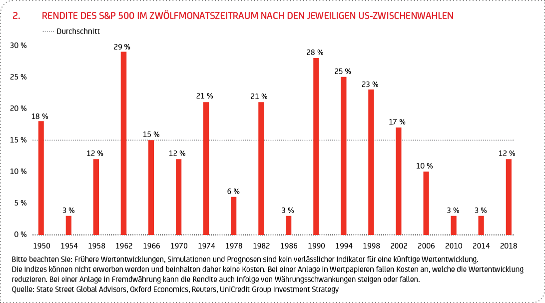 Ein Blick in die Historie lässt unterdessen vermuten, dass die Märkte das Wahlergebnis grundsätzlich positiv aufnehmen. In den vergangenen 18 politischen Zyklen ist der S&P 500 nach Angaben von Oxford Economics im Jahr nach den Zwischenwahlen um durchschnittlich über 15 % gestiegen (siehe Grafik 2). Die durchschnittlichen jährlichen Renditen des S&P 500 betrugen 14 %, wenn der Kongress geteilt war, so eine von Reuters zitierte Analyse von RBC Capital Markets basierend auf Daten seit 1932. Sie lagen bei 13 %, wenn der Kongress von den Republikanern gehalten wurde und der Präsident ein Demokrat war. Zum Vergleich: Als die Demokraten den Präsidenten und den Kongress kontrollierten, lag die Rendite bei 10 %.