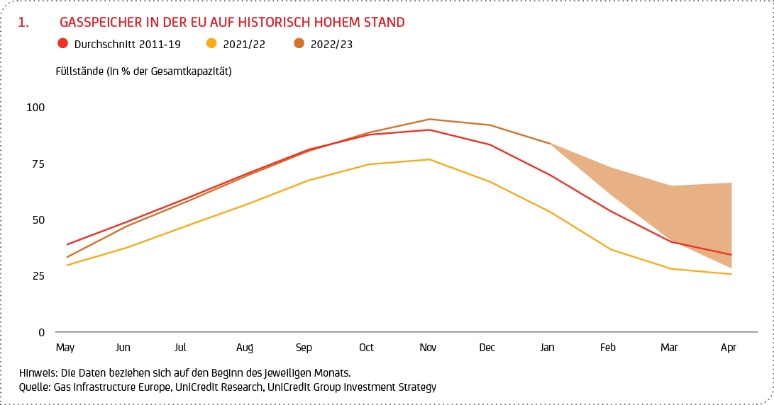 Vieles deutet darauf hin, dass die Europäische Union (EU) eine Gasmangellage in diesem Winter1 abgewendet hat. Dank einer Kombination aus Energiesparmaßnahmen, legislativen Weichenstellungen und zuvorderst mildem Wetter hat sich der Erdgasverbrauch in der EU in diesem Winter 2022/23, verglichen mit früheren Perioden, bislang in Grenzen gehalten. Zu Beginn des neuen Jahres herrschten auf dem gesamten europäischen Kontinent rekordverdächtige Temperaturen2. Und die europäischen Gasspeicher sind für diese Jahreszeit, in der die EU-Länder ihre Reserven normalerweise anzapfen, auf einem historisch hohen Stand. Damit tritt eine der Hauptquellen potenzieller Abwärtsrisiken für die EU-Wirtschaft, die vielen Beobachtern und politischen Entscheidungsträgern im vergangenen Jahr lange Zeit Sorgen bereitet hat, zumindest vorerst in den Hintergrund. Und die hohen Speicherstände sollten dazu beitragen, das Risiko von Engpässen auch im kommenden Winter zu verringern.