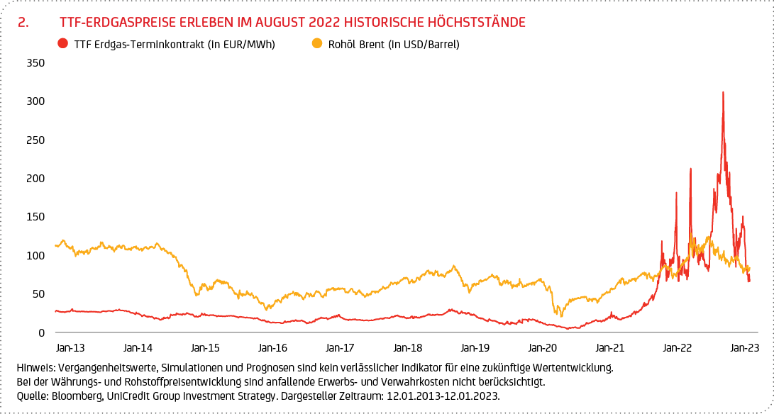 Die Entwicklungen der vergangenen Monate spiegeln sich auch in den Preisen für Erdgas wider, nachdem die niederländische TTF-Benchmark seit dem Beginn des Ukrainekrieges zunächst ein extremes Auf und Ab erlebte, das Ende August letzten Jahres in einem Allzeithoch von fast 350 Euro pro Megawattstunde (EUR/MWh) gipfelte. Seit Mitte Dezember ist der TTF um mehr als 50 % und seit seinem Höchststand um mehr als 70 % gefallen (siehe Grafik 2). Insbesondere in den letzten Wochen fiel der Preis nochmal deutlich, auf den niedrigsten Stand seit Februar 2022, also noch vor dem Beginn des Krieges. Auch die Volatilität ging dank konstant hoher Füllstände der Erdgasspeicher zurück.