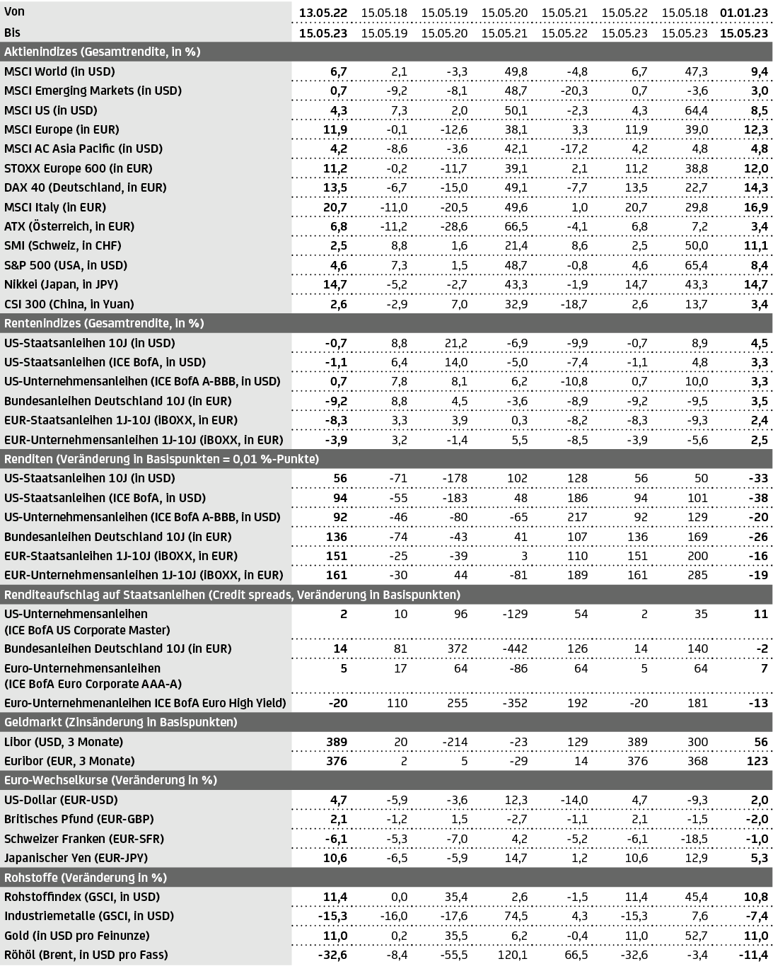 Bitte beachten Sie: Vergangenheitswerte und Prognosen sind kein verlässlicher Indikator für eine zukünftige Wertentwicklung. Indizes können nicht erworben werden und beinhalten daher keine Kosten. Bei einer Anlage in Wertpapieren fallen Kosten an, welche die Wertentwicklung reduzieren. Die Rendite bei Anlagen in Fremdwährungen kann auch infolge von Währungsschwankungen steigen oder fallen. Um die Entwicklung von Staatsanleihen in einem festen Laufzeitbereich abzubilden, werden so genannte synthetische Anleihen berechnet. Dabei wird jeweils die zum relevanten Zeitpunkt „passendste“ reale (echte) Bundesanleihe herangezogen und als Referenz für die Renditechance der synthetischen Anleihe genommen. Abgebildet ist die Entwicklung der erwarteten Rendite bis zur Endfälligkeit (Yield to maturity) unter folgenden Voraussetzungen: bedingungsgerechte Bedienung der Zinszahlungen und Einlösung sowie Halten bis Endfälligkeit. Insoweit handelt es sich um eine Renditechance. Die Renditechancen spiegeln die unterschiedlichen Risikoeinschätzungen der Anleger zu den jeweiligen Produkten bzw. Ländern wieder (höhere Renditechance=höhere Risikoeinschätzung). Die synthetischen Anleihen können nicht erworben werden und beinhalten daher keine Kosten. Bei Währungen und Rohstoffen sind anfallende Erwerbs- und/oder Verwahrkosten nicht berücksichtigt. Quelle: Quelle: Refinitiv Datastream. Stand: 15.05.2023.
