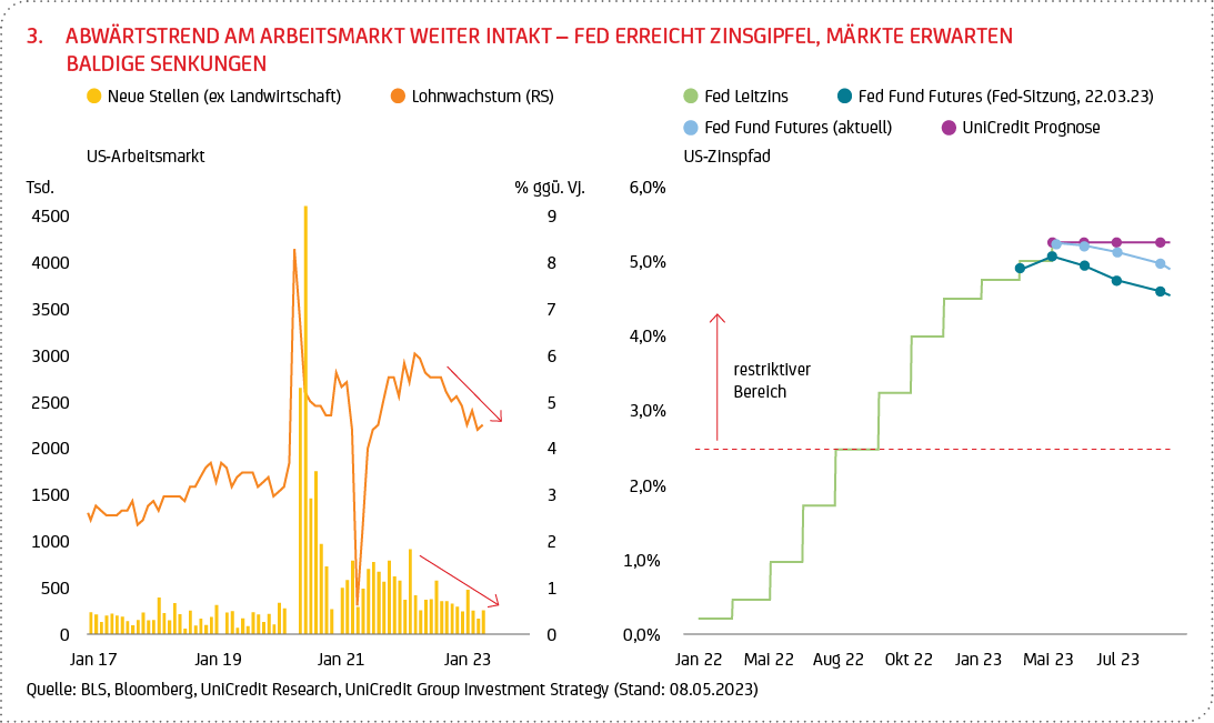Die US-Wirtschaft verzeichnete im April einen robusten Zuwachs von etwa 250,000 neuen Stellen, nachdem deren Anzahl im Vormonat auf 165,000 nach unten revidiert worden war (siehe Chart 3). Damit war der Zuwachs im April größer als erwartet, trotz umfangreicher Abwärtskorrekturen für die Monate Februar und März (149,000 Stelle). Darüber hinaus legten die durchschnittlichen Stundenlöhne im Jahresvergleich um 4,4 % zu (ein leichter Anstieg gegenüber März), wodurch sich die Verdienste nach wie vor über der Spanne von 3 % bis 3,5 % befinden, welche von der Fed als konsistent mit ihrem Inflationsziel von 2 % angesehen wird. Unserer Ansicht nach werden die Zahlen aus diesem Arbeitsmarktbericht die Fed zwar nicht dazu veranlassen, die Zinsen im Juni zu erhöhen. Da der Arbeitsmarkt aber weiter angespannt bleibt und das Lohnwachstum weiterhin zu hoch ist, dürfte die US-Notenbank ihren geldpolitisch restriktiven Kurs auch in das zweite Halbjahr hinein beibehalten. Dafür spricht auch die nach wie vor zähe Inflation bei den Verbraucherpreisen. Im April war die Gesamtrate im Jahresvergleich nur leicht zurückgegangen (auf 4,9 % von 5,0 % im März), wenngleich sich die Kernrate weiter abgeschwächt hat (auf 5,5 % von 5,6 %). Dennoch stimmen uns die jüngsten Inflationszahlen optimistisch, dass der Gipfel bei der Kernrate nun erreicht und überschritten sein dürfte, bzw. dass der Disinflationstrend über die nächsten Monate weitergeht.