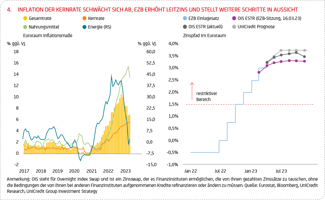 Die schwächere Inflationsdynamik bei der Kernrate erlaubte es der EZB, das Tempo der Zinsschritte auf ihrer Mai-Sitzung auf 25 Bp zu drosseln (von zuvor 50 Bp im März), wodurch der Einlagensatz auf 3,25 % angehoben wurde (siehe Chart 4). Dennoch hat die Notenbank signalisiert, dass noch weitere Zinsschritte kommen werden, auch wenn der Ausblick für derartige Zinsanhebungen recht vage erscheint. Dies ist aufgrund der anhaltend hohen Unsicherheit sicherlich beabsichtigt, um sich ein hohes Maß an Flexibilität zu erhalten. Wir gehen weiterhin davon aus, dass es noch zwei weitere Zinsanhebungen von jeweils 25 Bp, im Juni bzw. Juli, geben wird.